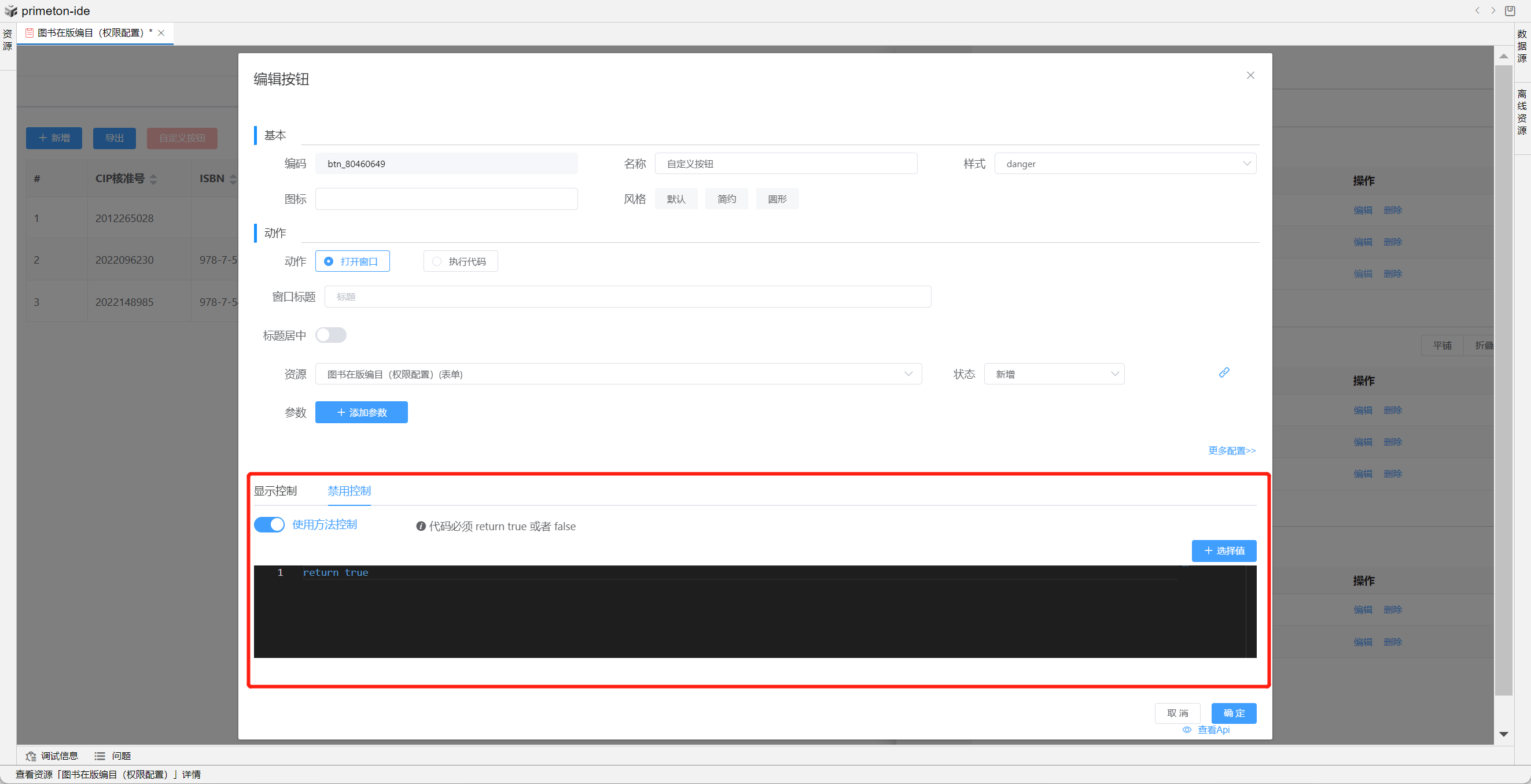 在视图设置-按钮设置中添加行内自定义按钮,配置如下