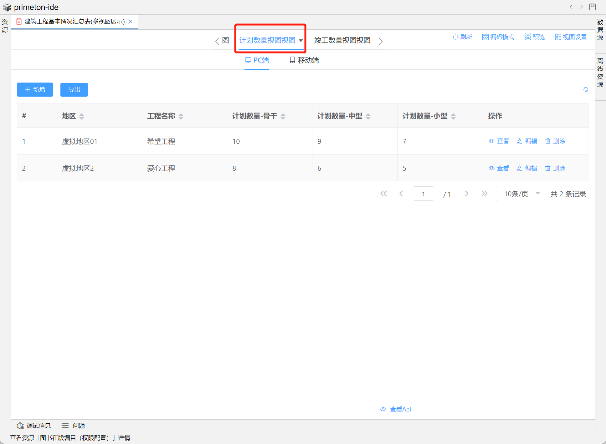 - 视图可以进行表格设置、显示字段、快速筛选、左侧导航、动作设置、高级设置、移动端设置一系列操作。切换为编码模式下更可以直观的查看和调试视图代码。