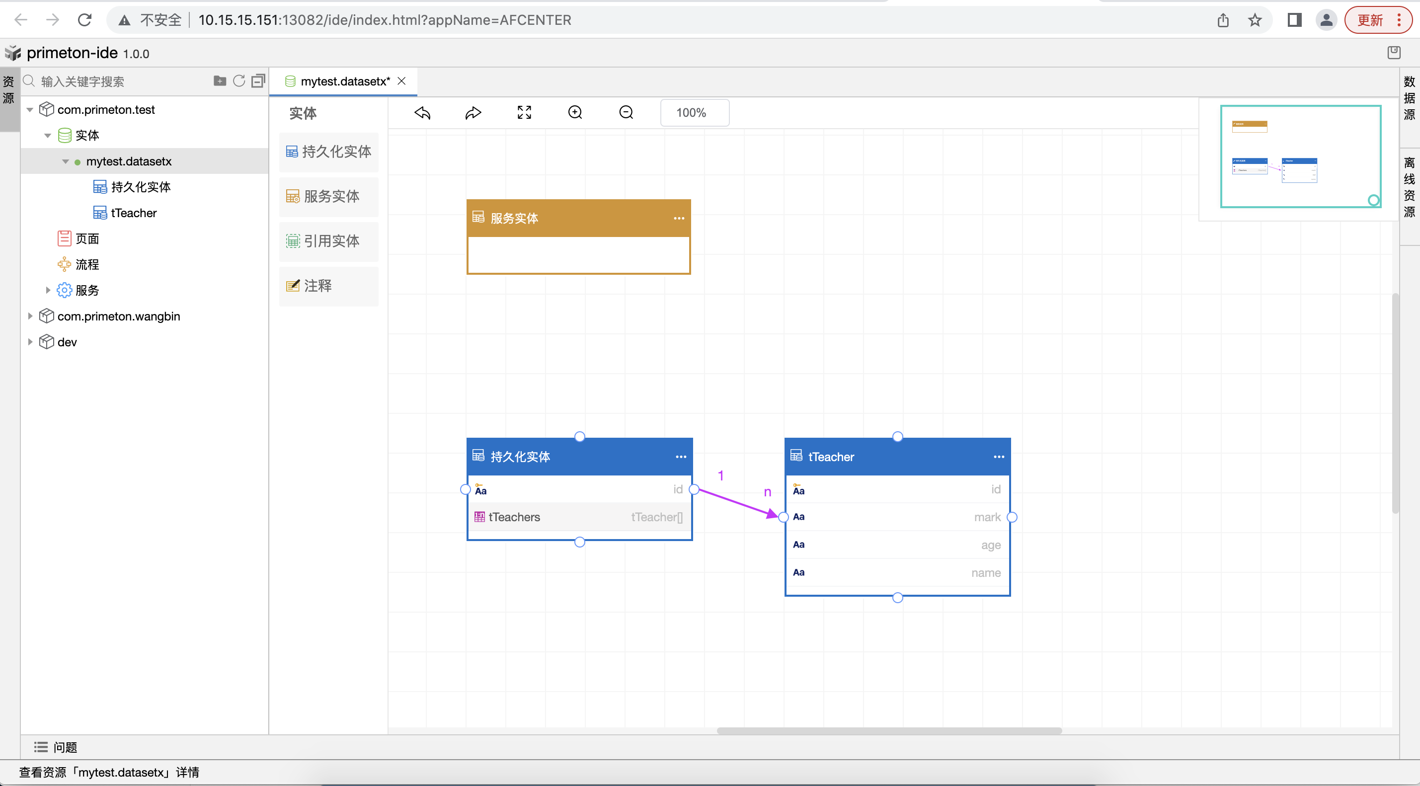 引用实体还可以从资源树中,选择其他实体集的持久化实体,拖入到画布中。示例是从test实体集拖入实体到本实体集中。