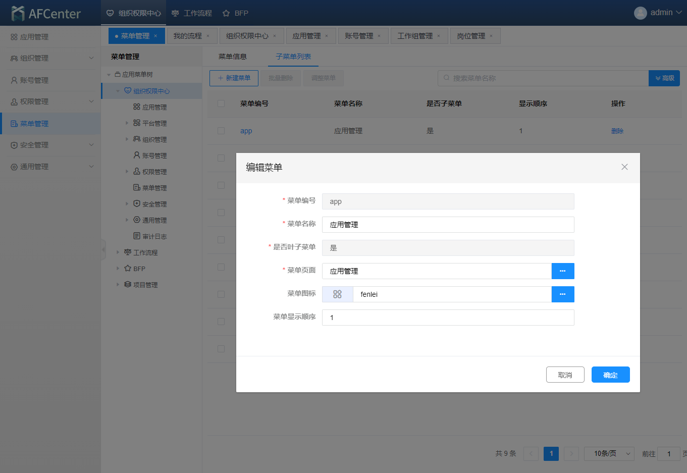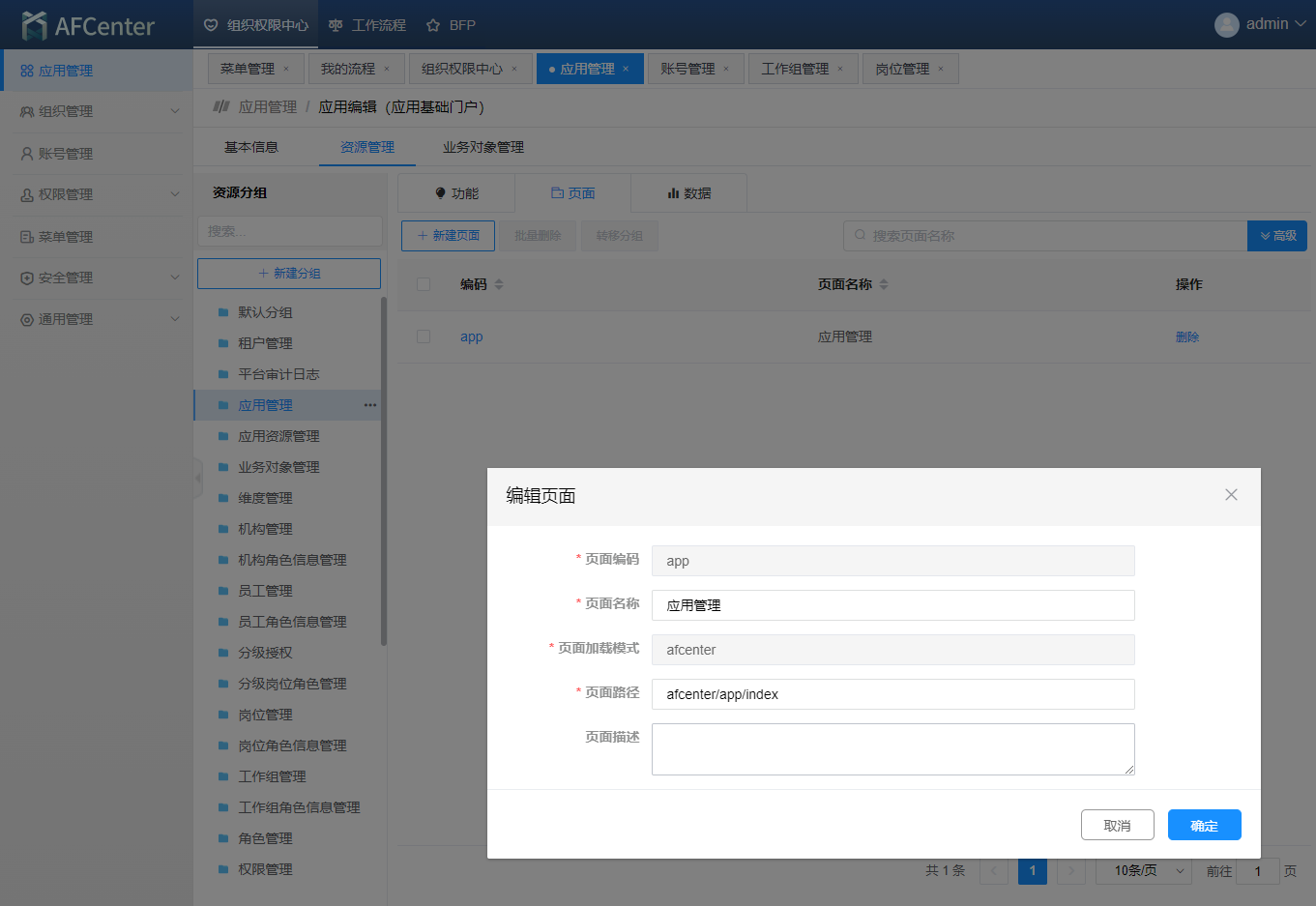 其中页面路径为afcenter源码项目中base\src\views 下需要添加页面资源的相对路径。注意:地址连接用的是 '/' 例如: 需要添加的页面在afcenter源码中的位置为base\src\views\afcenter\app\index.vue 那么页面路径为afcenter/app/index