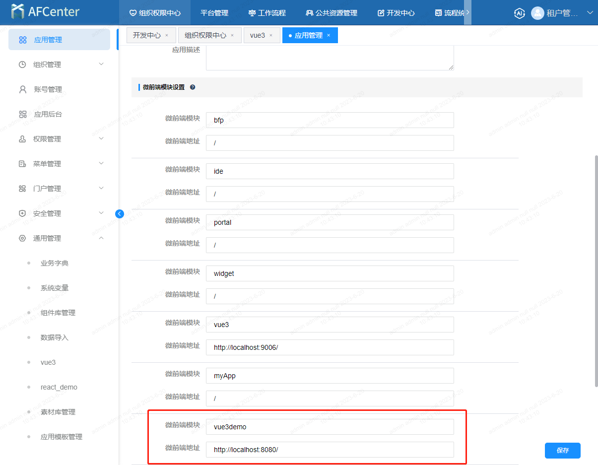 • 步骤1:配置微前端。在应用的基本信息里配置微前端模块;