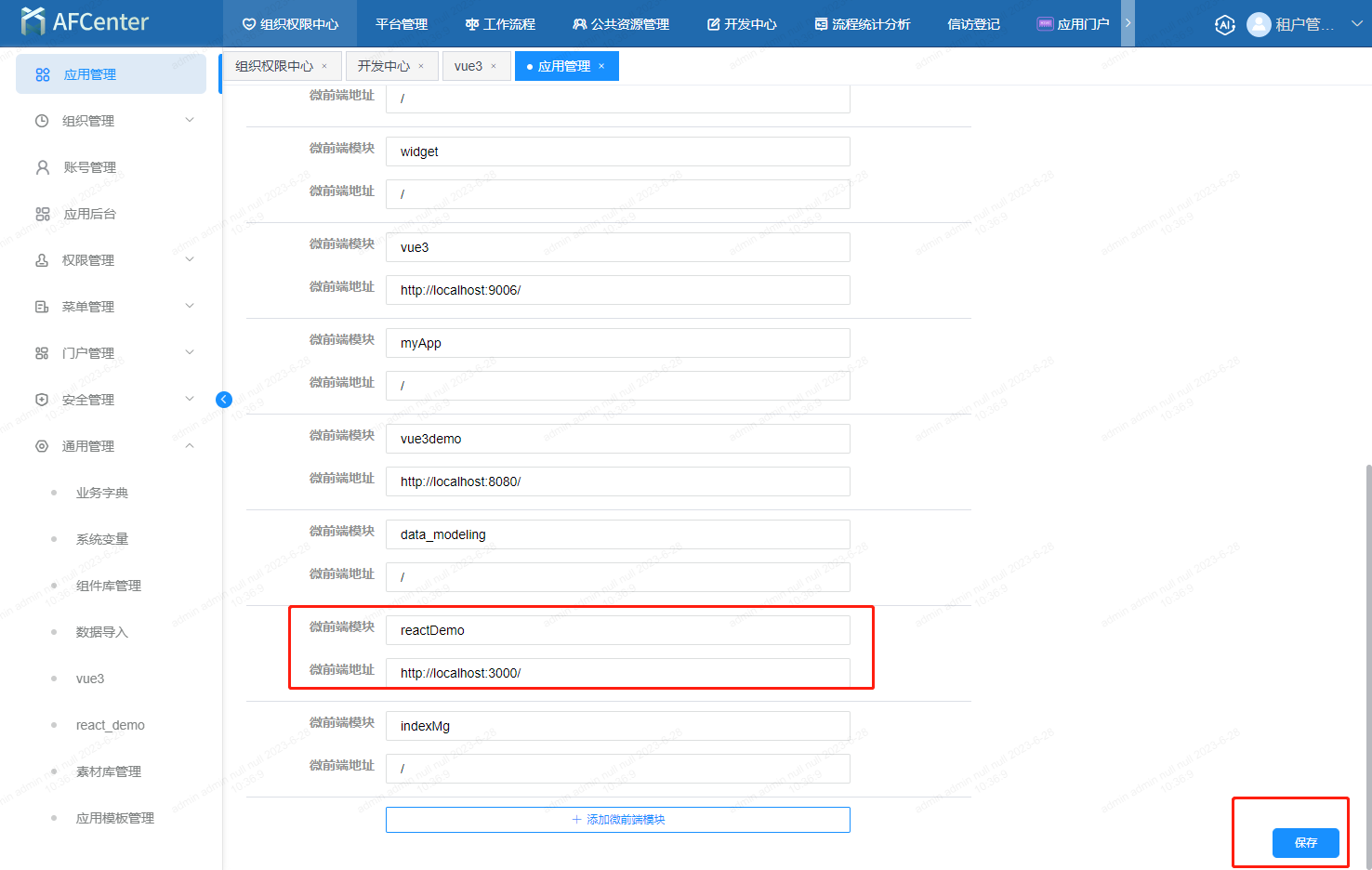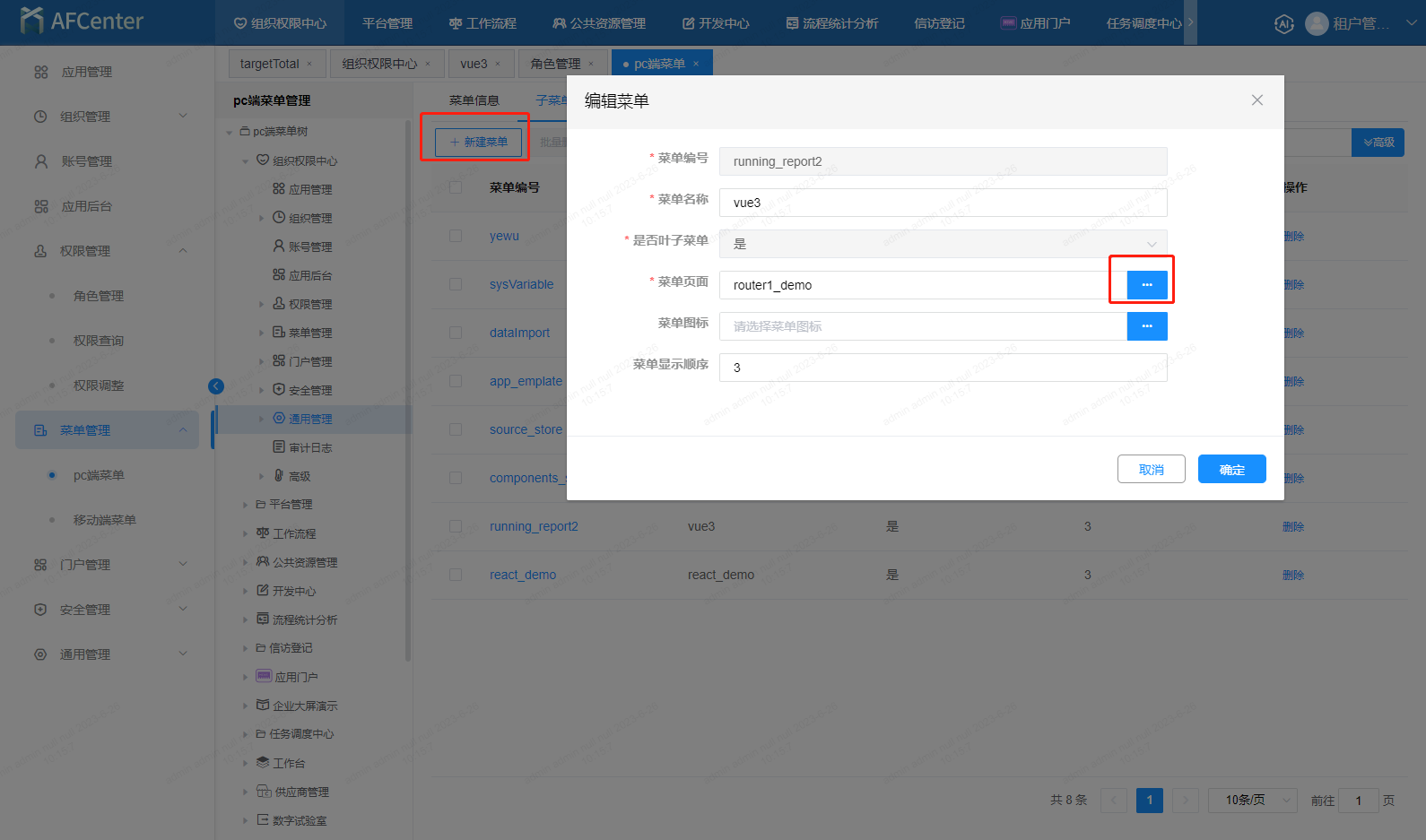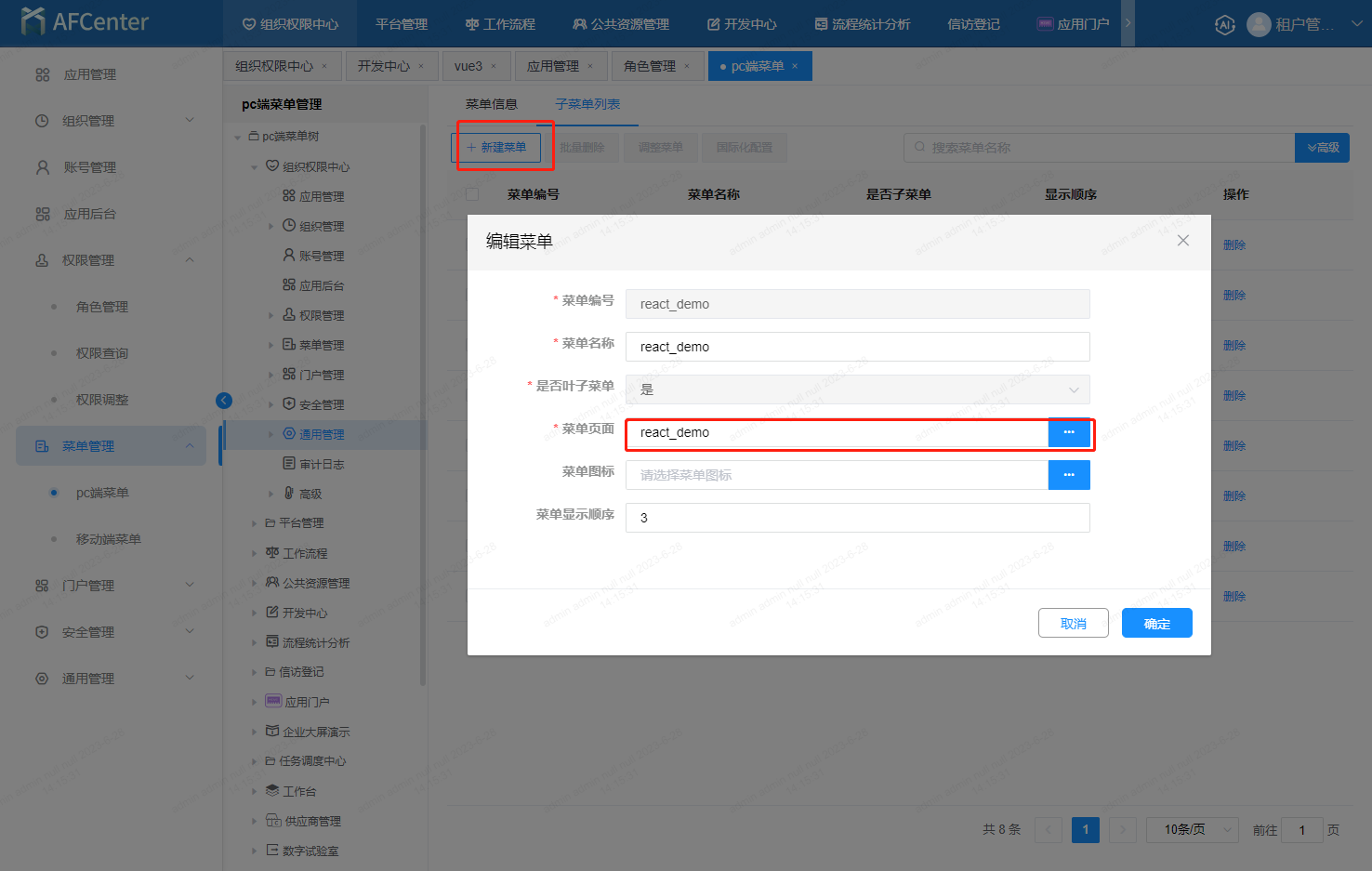 ​ 这里列举两个异构微前端页面挂载在afcenter菜单中展示的操作步骤,vue3和react类型项目。