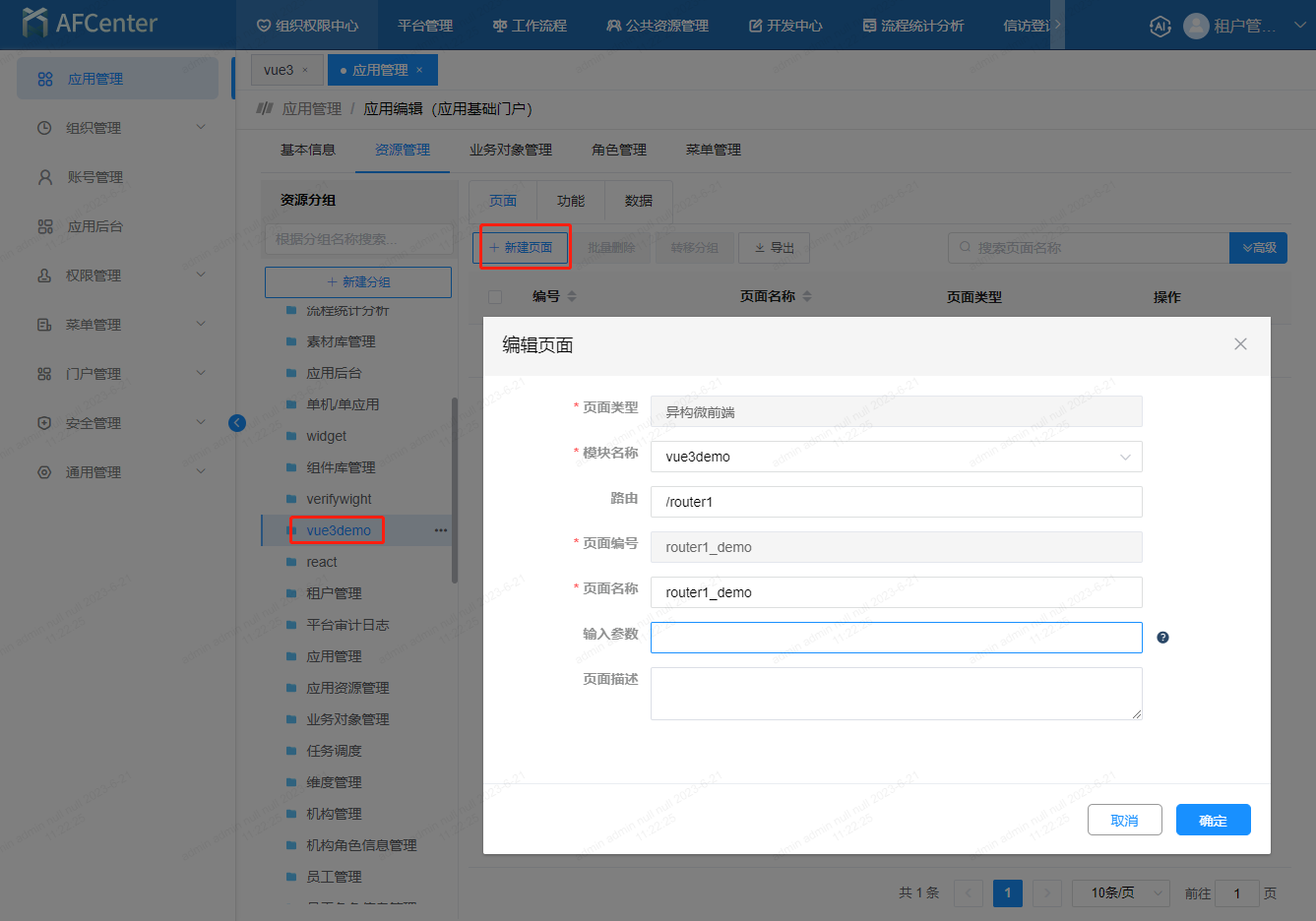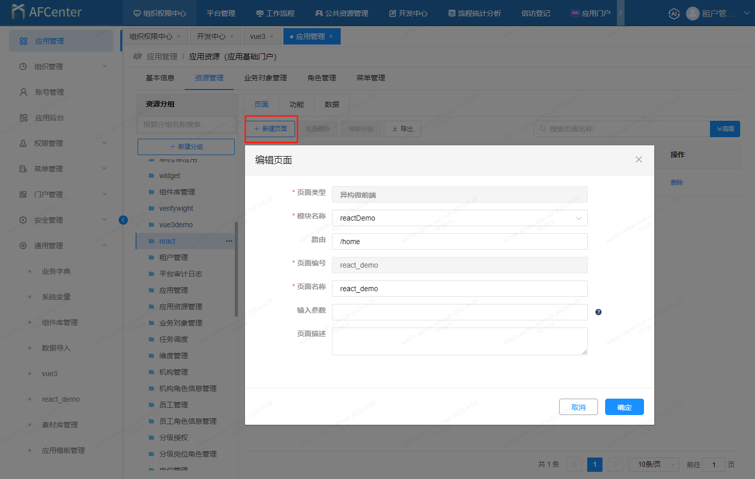 • 步骤2:配置页面。在资源管理里添加页面,页面类型为异构微前端,选择刚添加的模块名称,以及符合的路由等