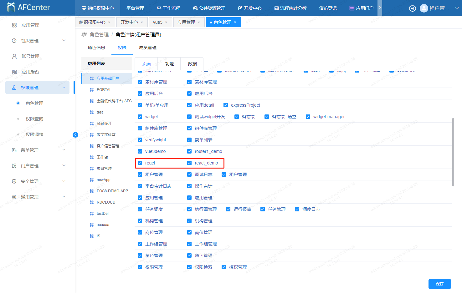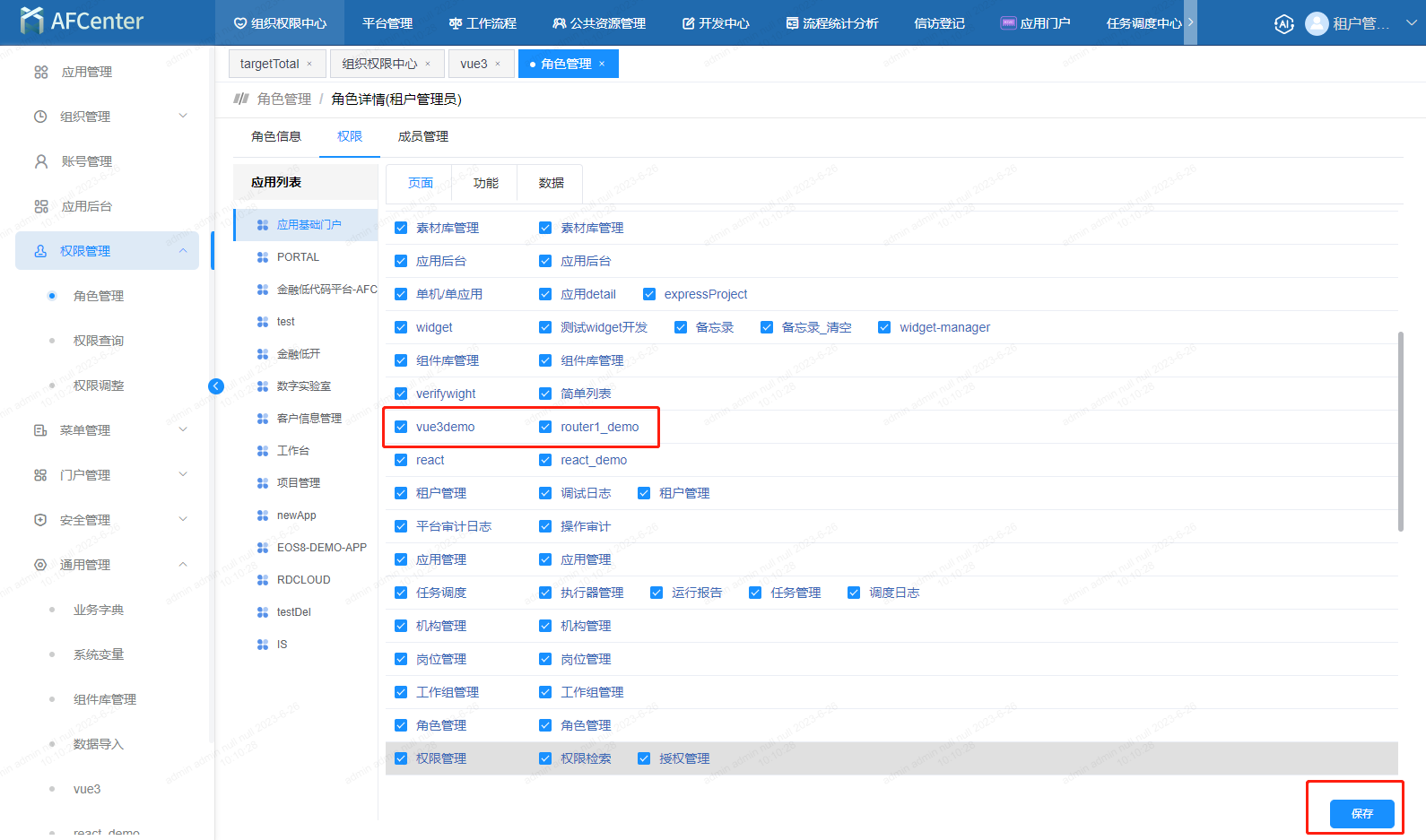 • 步骤3:添加权限。在权限管理下的角色管理中给角色添加权限