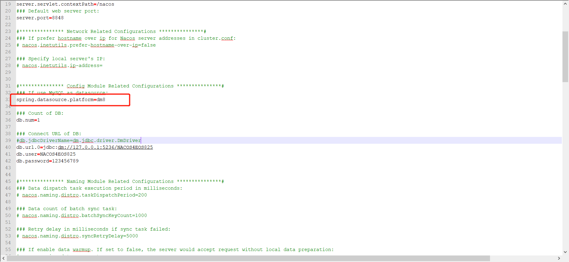 EOS Low-Code Platform 8发布中携带的nacos应用组件在连接达梦数据库时需要特别注意,在conf中的application.properties文件中spring.datasource.platform=dm8,这里值必须是固定参数dm8。直接写dm启动nacos并不会报错,nacos会启用内置数据库进行数据存储交互。