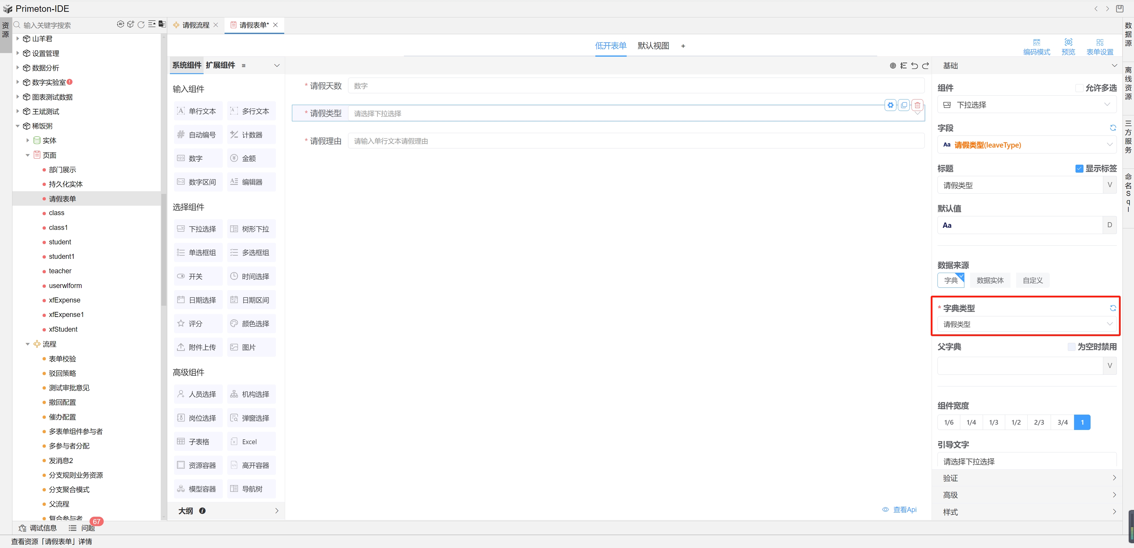 创建表单,给字段{请假类型}绑定请假类型业务字典。