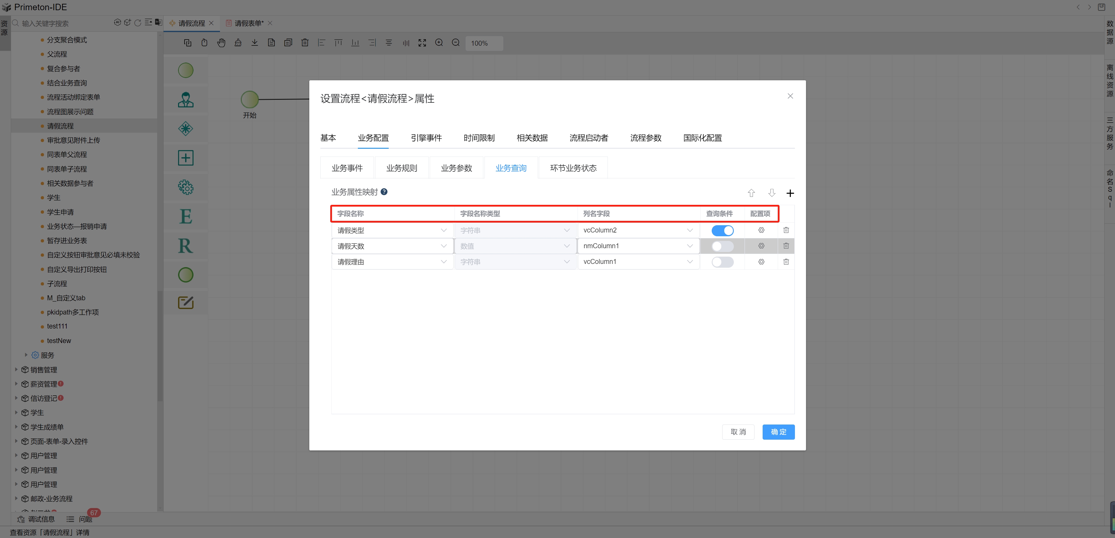 创建流程并且绑定上步创建的表单,设置业务查询。