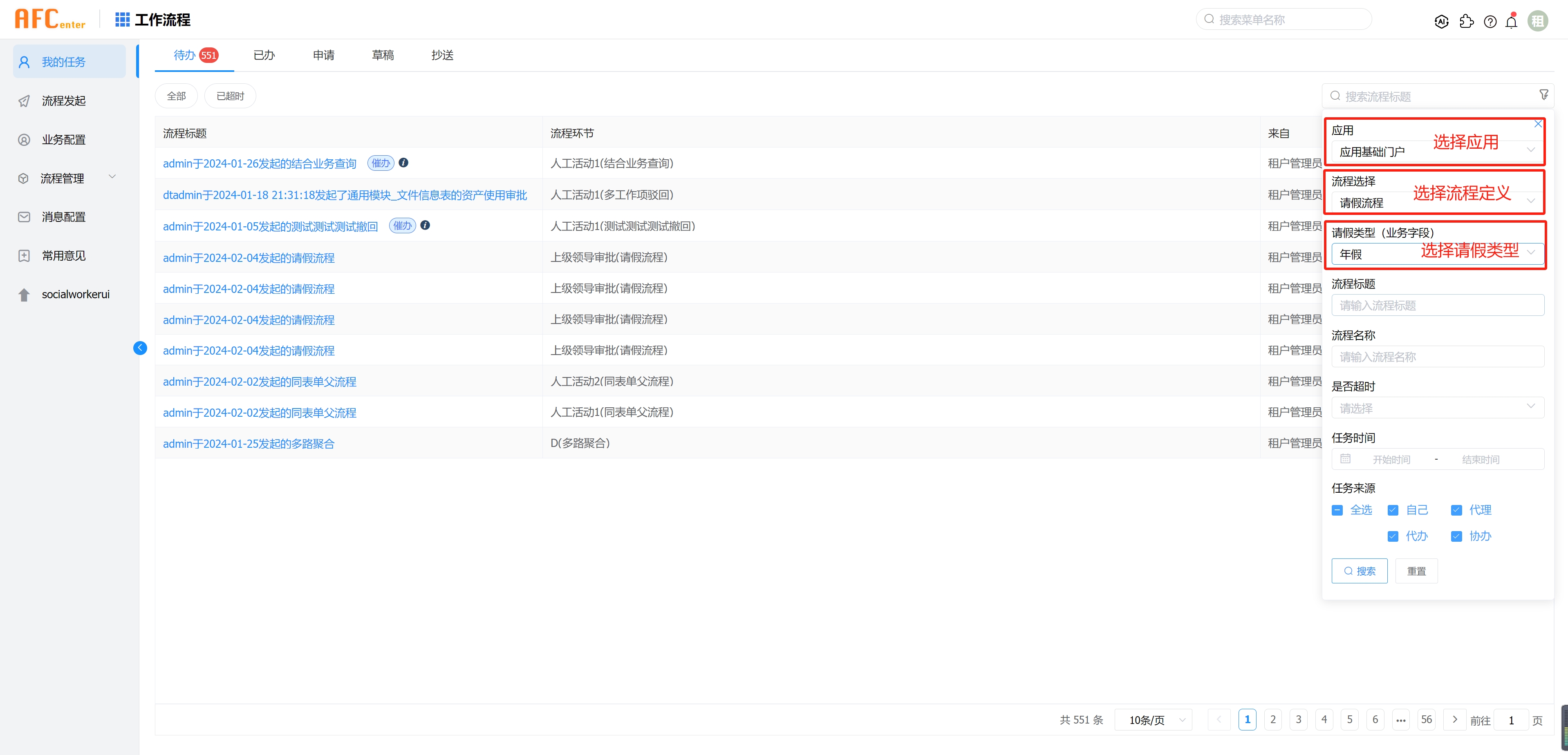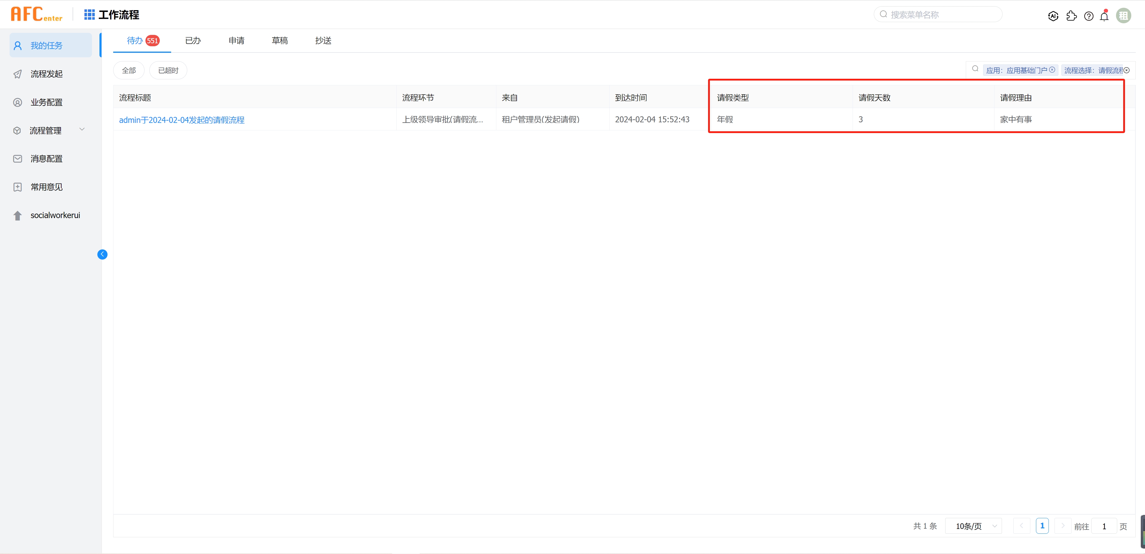 2. 任务中心列表查询选择对应应用下的“请假流程”,即可出现配置的属性列作为查询结果或查询条件。 如下图以待办任务列表为例,已办、申请同理。