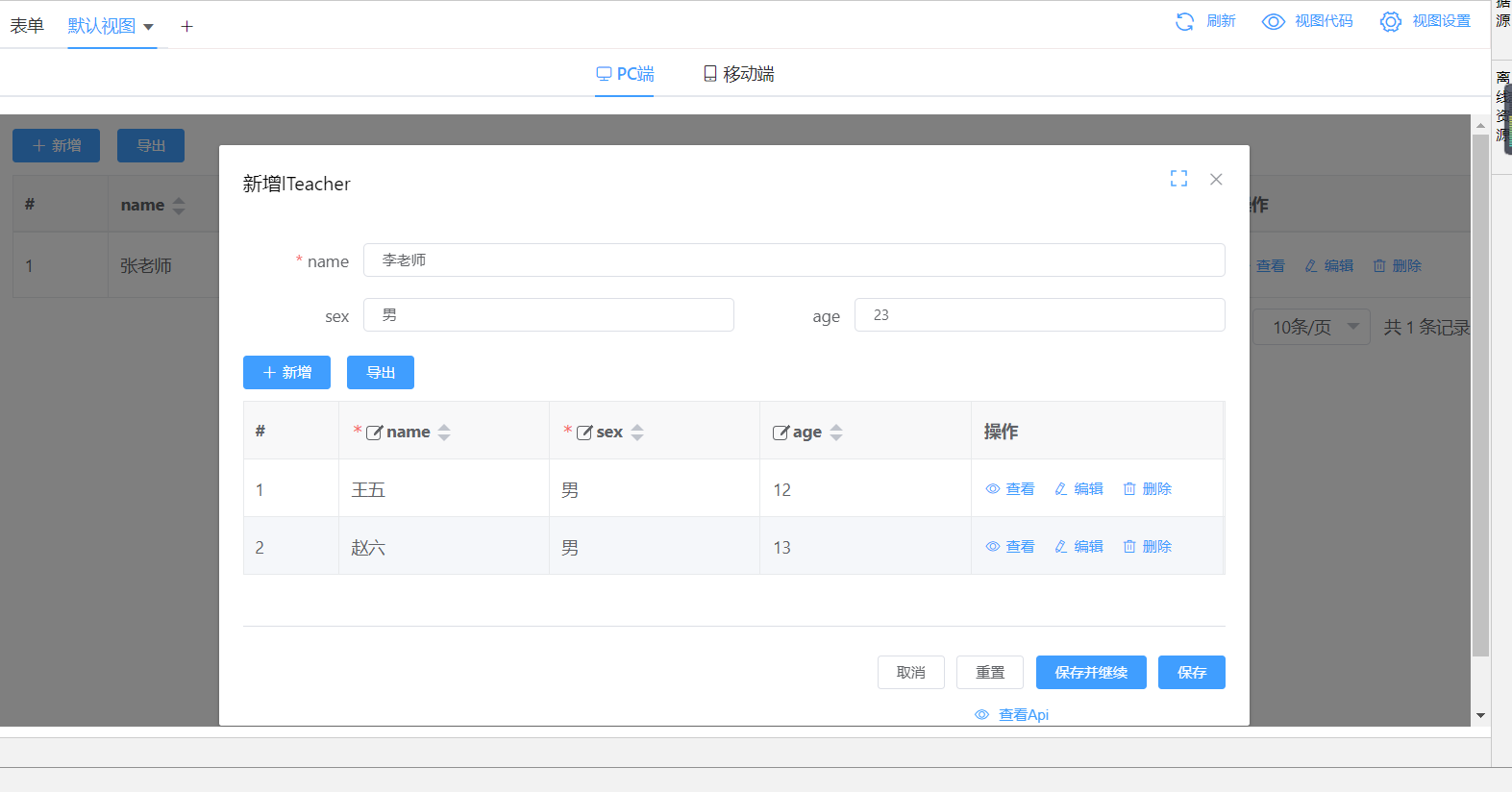 同时在IStudent实体中每条数据都会加载Iteacher的关联实体,在IStudent的视图中,可以添加绑定Iteacher的列字段,如下图为教师名称绑定列名ITeacher.name字段,这样每条IStudent数据都可以展示关联的ITeacher信息。