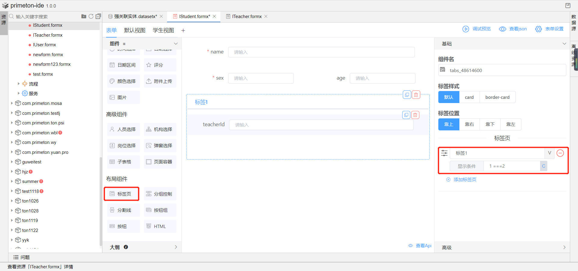 3.也可使用布局组件标签页进行控制标签页内的组件的显示与隐藏,输入显示条件,即可根据返回值true/false来进行组件的显示与隐藏。